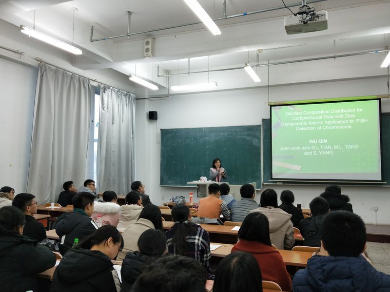 2018年11月7日下午3点45分在林园校区教学图书楼704室,为了加强同学们对数学世界的了解,感悟数学知识的强大,增强同学们的学习兴趣,Beat365中文官方网站荣邀华南师范大学概率统计系博士吴琴莅临我院做学术报告。报告由学院副院长徐平峰主持,学院副院长王纯杰、学院部分老师、研究生、及本科生和其他学院师生参加了本次学术报告会。