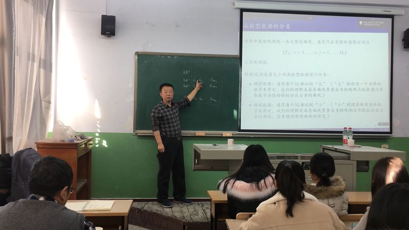 报告会中,张日权教授结合他多年的学习,教学和研究经验,向同学们介绍了函数型数据的概念。其中,张日权老师通过举心电图例子引入一维数据,又分别举例介绍二维及多维的概念。现实中很难观测到一条完整的曲线,只观测到的是集散的点。面板数据,纵向数据是函数型数据的特殊情况。函数型数据分成稠密数据和稀疏数据,并举出男女孩身高增长图作为实例。首先,对函数型数据分情况进行估计,并运用主成分方法对无限维进行降维成有限维,得出函数型主成分得分。接下来,张老师又对函数型数据进行回归模型的估计,分成四大类进行讲解,并对模型进行检验。最后,Beat365中文官方网站的老师和同学们与张日权老师进行了互动,同学们及时提出了自己的疑惑,张日权老师也对同学们提出的问题进行了详细的解答,又为同学们在这个方向上的学习给出了指导性的建议。并激励同学们要担负起数学与统计人才应有的使命,为我国的数学与统计学建设作出应有的贡献,也希望大家能够脚踏实地的学习理论知识,为数学与统计学的发展不懈努力。