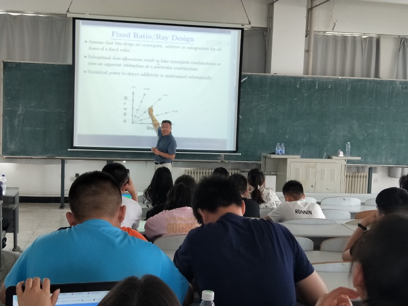 报告会中,学院副院长王纯杰先向同学们介绍了方宏彬副教授的个人简历,然后,方宏彬老师简单介绍本人的工作经验,简单介绍了关于肺癌和乳腺癌的一些案例和病例。主题是如何找到新药针对病情。讲述如何去治疗癌症,两种新药针对一种疾病的效果是加和作用还是促进作用,进而了解新药的效果,运用了一些关于数学统计的公式推倒去验证结论;讲述了应该怎么样去做实验去验证结论,清楚的讲述了统计的应用以及大部分人对统计理解的偏差。老师和学生提出提出了一些问题,方洪斌老师都作出了一一解答并且解答的非常详细,使得学生和老师得到了知识的提升,加大了对此方向更深刻的了解。
