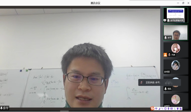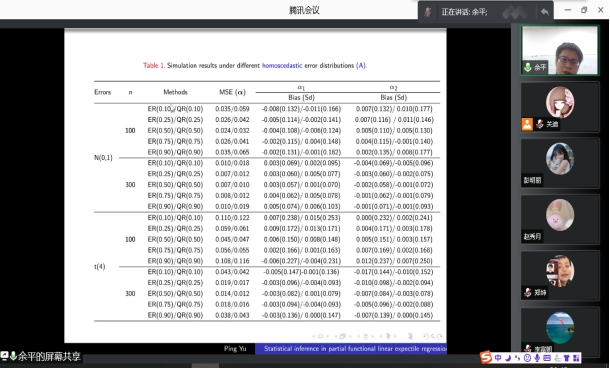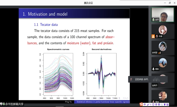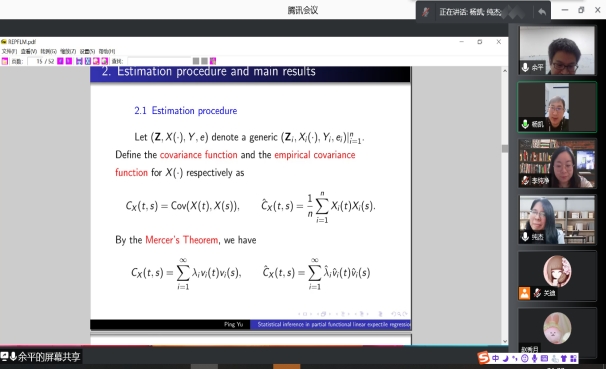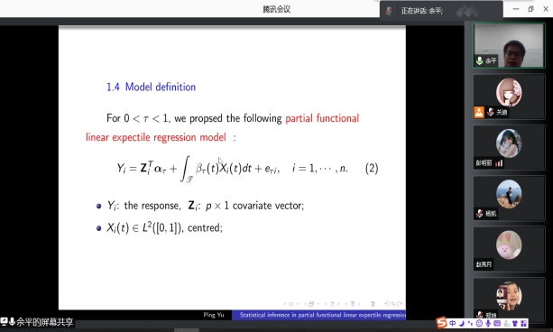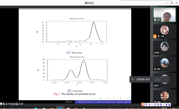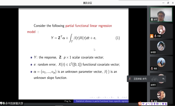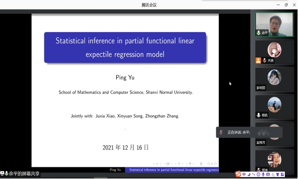 2021年12月16日晚上20:00我院特邀山西师范大学余平教授做线上学术报告,报告由统计系主任杨凯老师主持,学院部分老师、全体研究生参加了本次线上学术报告会。