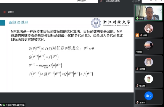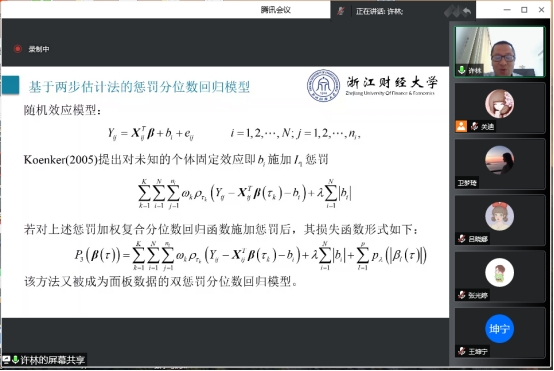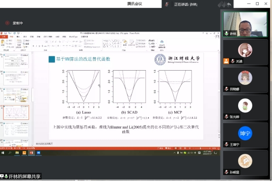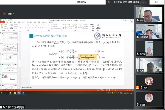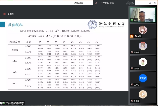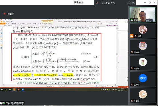 报告过程中,许林老师利用MM算法提出具有即时适应性的动态阈值替代函数进行若变量筛选,并给出针对于面板数据随机效应模型的 Two-step 估计过程,并且利用渐进理论证明了新替代函数的算法与原替代函数的算法具有相同的收敛性;与此同时,老师还比较并讨论了两种替代函数的性能。数值模拟结果和实例数据分析过程表明,当迭代估计的初始值较大时,本文所提出的替代函数的具有更好的统计推断效果。