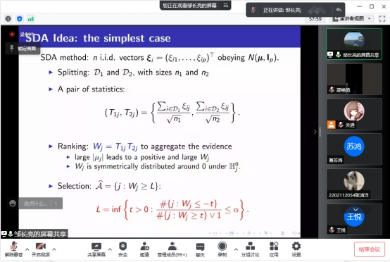 报告中,邹长亮教授简要介绍了多个测试中依赖下的FDR控制问题、BH过程以及新的信息共享策略—对称数据聚合(SDA)。随后,邹长亮教授着重介绍了对称数据聚合(SDA)的三个步骤,第一步将样本分为两部分,这两部分都用于构建统计数据来评估反对无效的证据。第二步将两个统计数据进行汇总,形成一个新的符合系统测量特性的排名统计。第三步利用正、负零统计量之间的对称性来控制FDR,在排序中选择一个阈值。