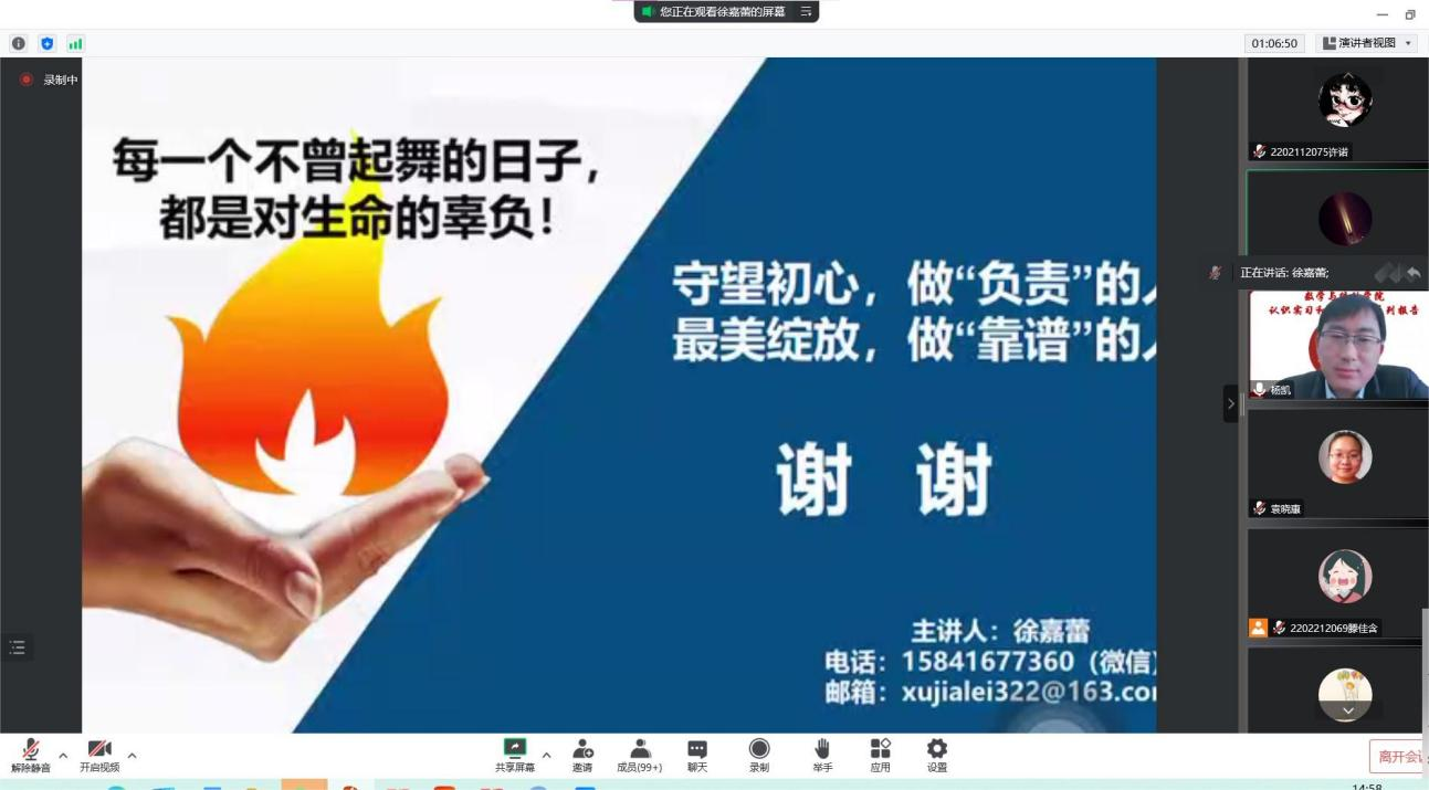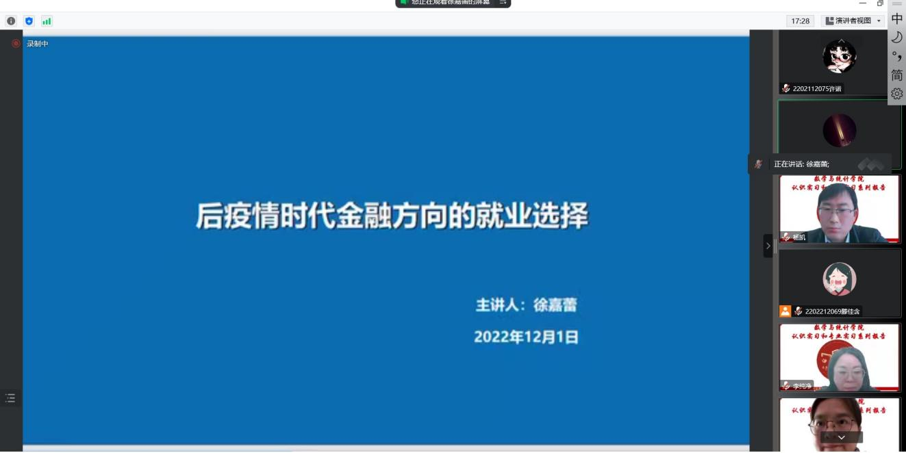 (通讯员:杨凯)2022年12月1日下午14:00,我院邀请中国建设银行锦州城南支行徐嘉蕾行长做题为《后疫情时代金融方向的就业选择》的报告,本次报告由学院统计系主任杨凯主持,学院副院长李纯净、统计系支部书记袁晓惠,以及统计系胡茜等青年教师以及2020级、2019级本科生以及研究生参加了本次线上报告。