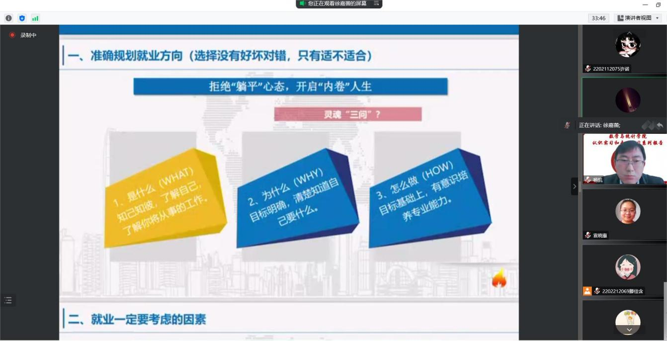 报告过程中,徐嘉蕾行长通过与日常生活密切相关的房地产政策方面进行举例,帮助大家理解金融领域的相关理念以及后疫情对金融业的影响。进一步,在有关就业方面,徐行长从“是什么”、“为什么”和“怎么做”三个问题出发,提出了自己有关就业方向和规划的见解,并在知己知彼、有的放矢、章法有度以及坚持专业四个主要方面给出相关就业建议。