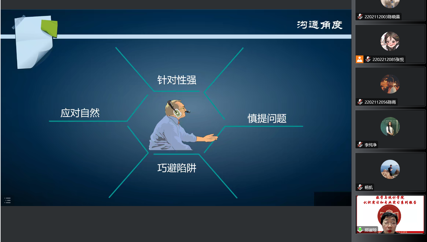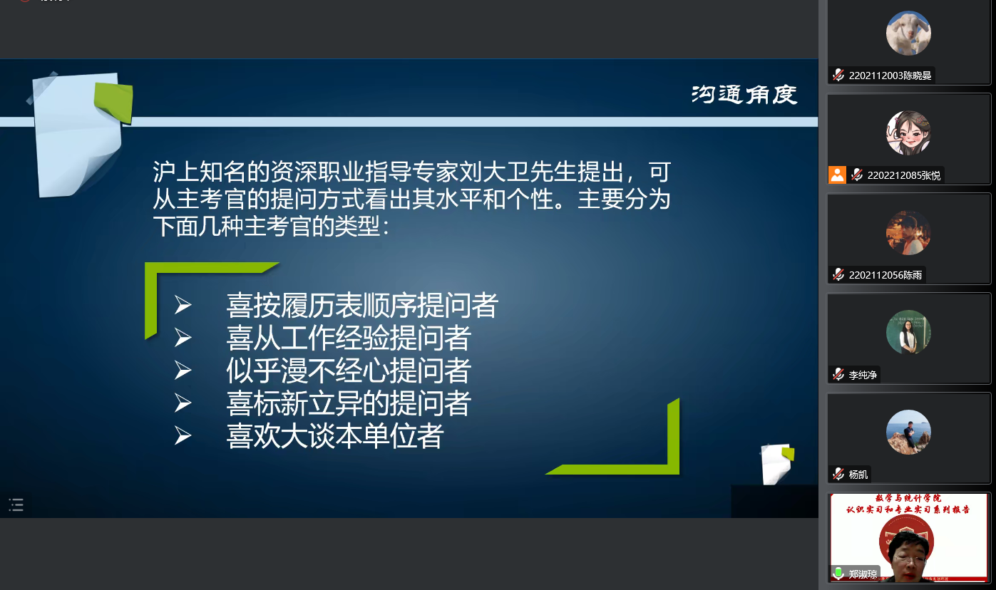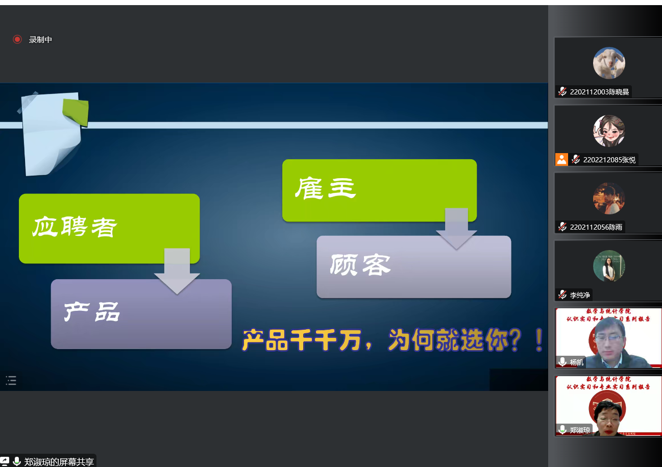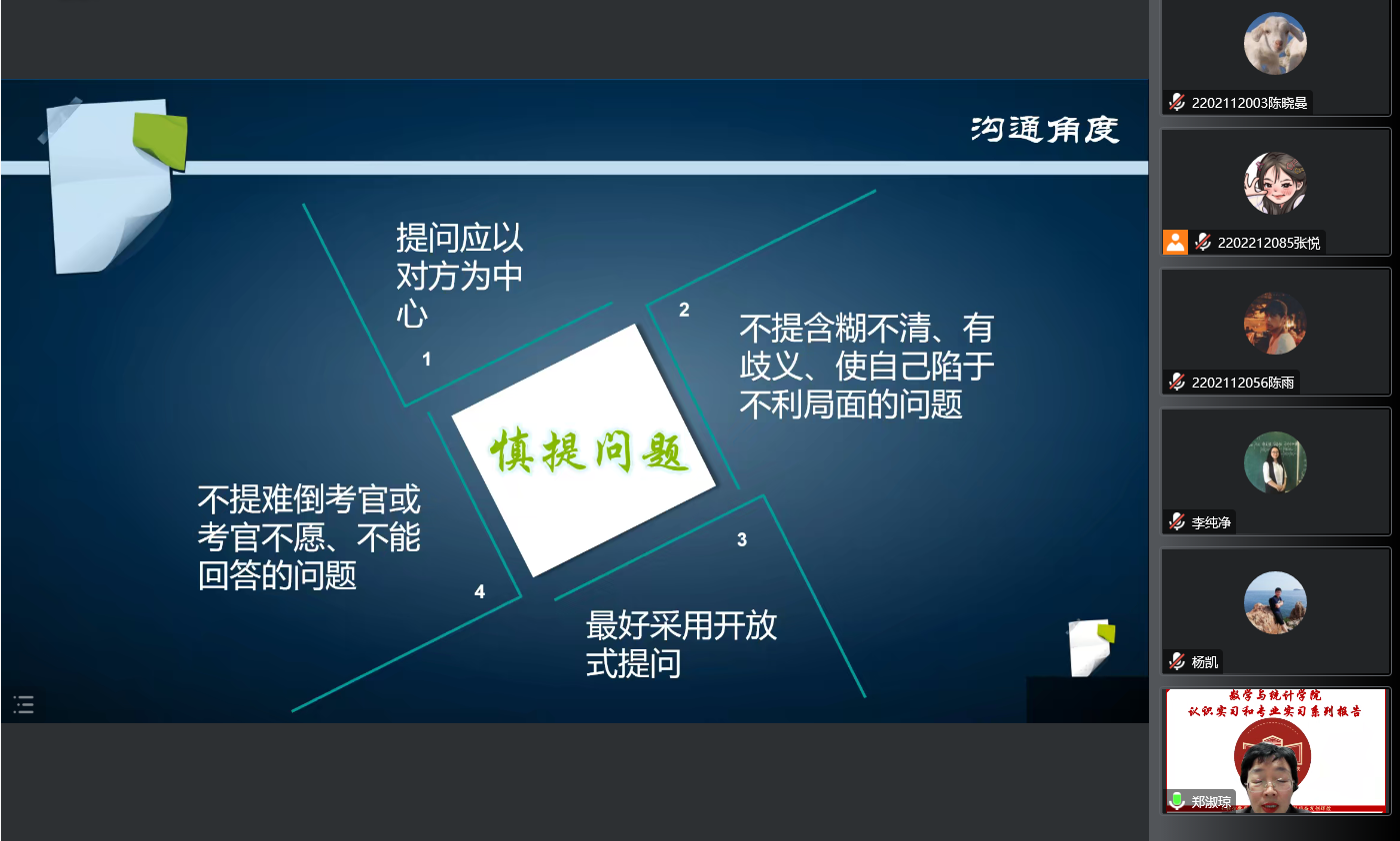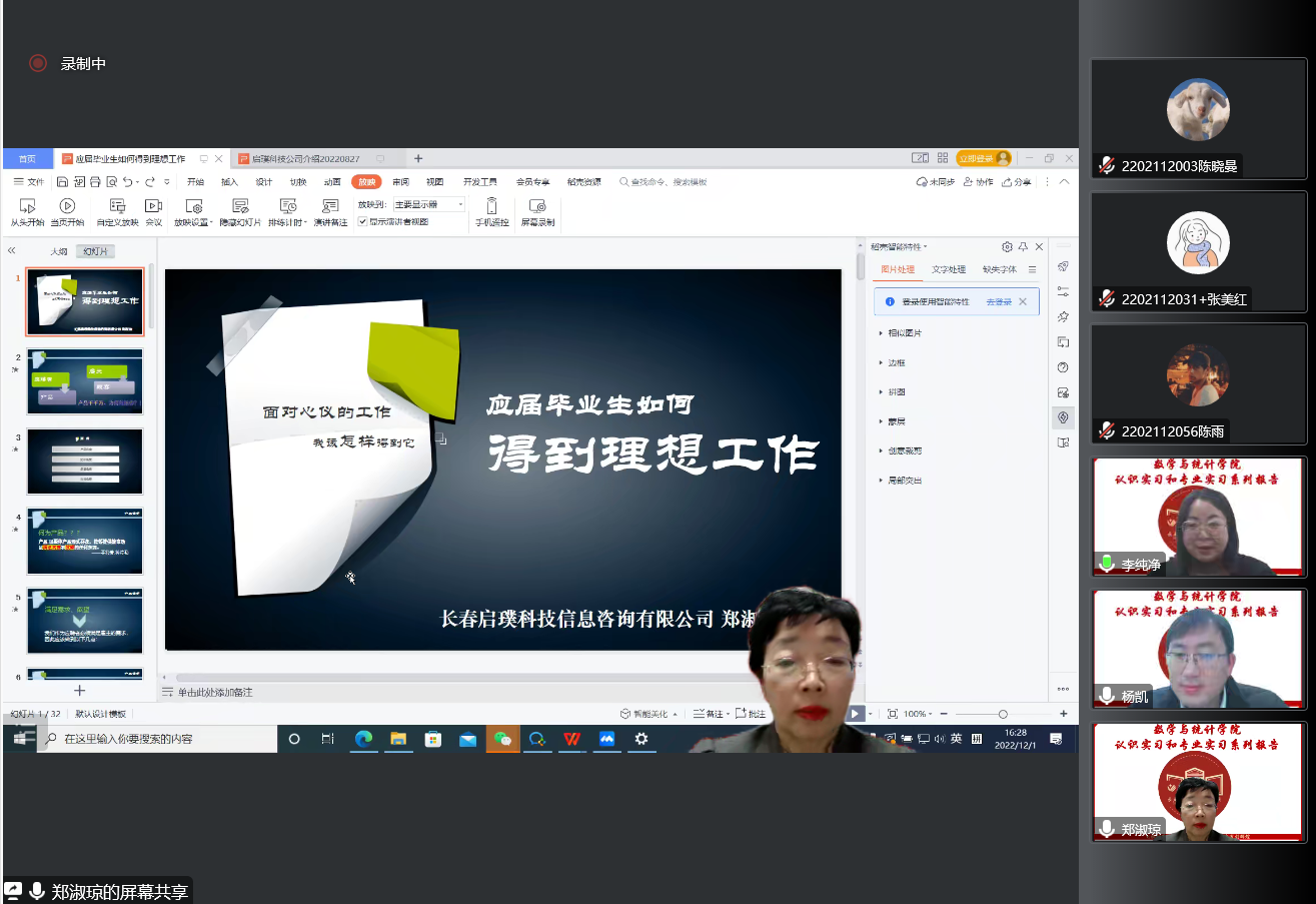 (通讯员:杨凯)2022年12月1日下午16:00,我院邀请长春启璞科技有限公司郑淑琼董事长做题为《应届毕业生应该如何找到理想的工作》的报告。本次报告由学院统计系主任杨凯主持,学院副院长李纯净、统计系支部书记袁晓惠,以及统计系胡茜等青年教师以及2020级、2019级本科生以及研究生参加了本次线上报告。