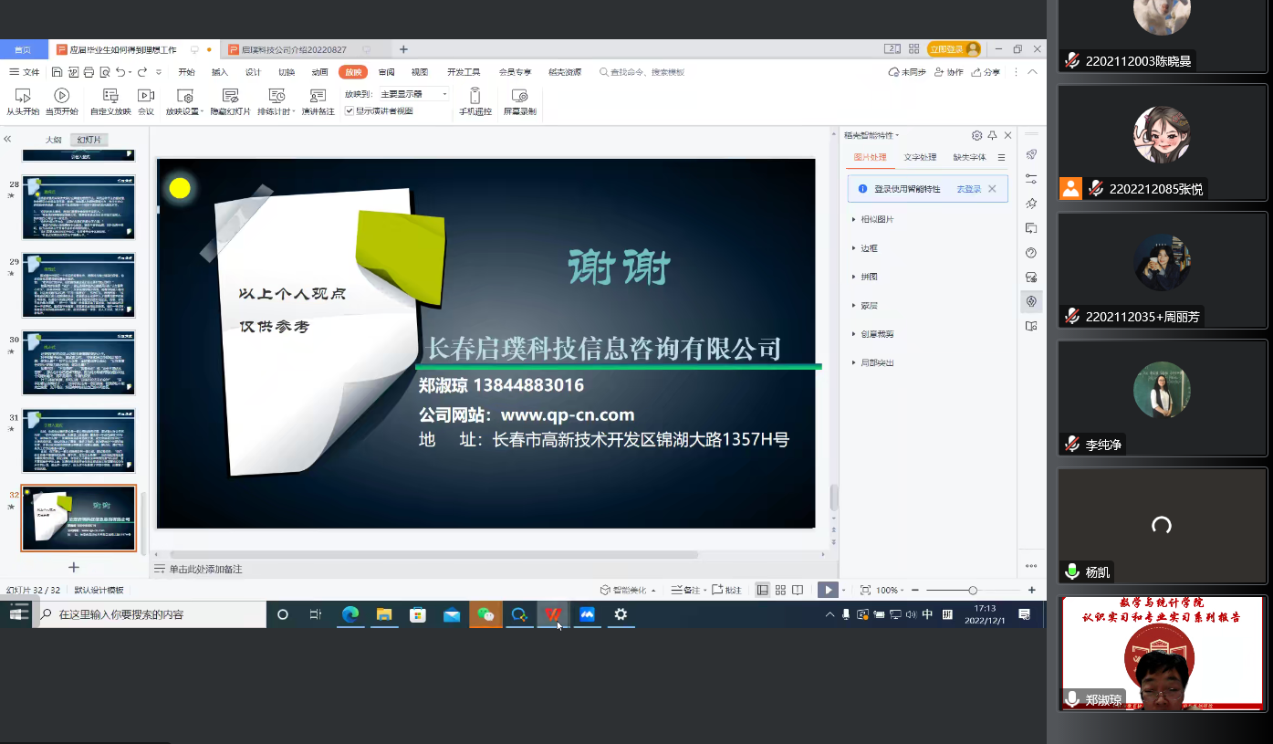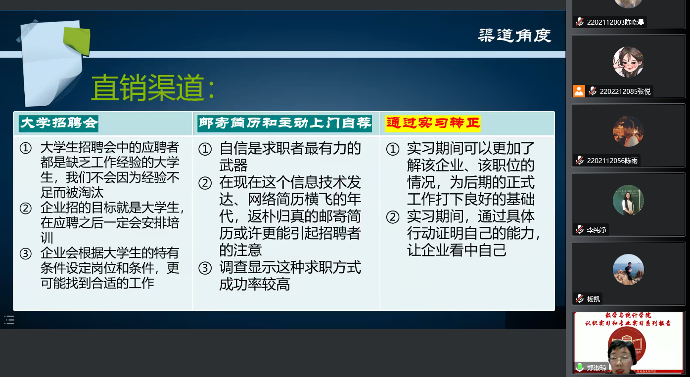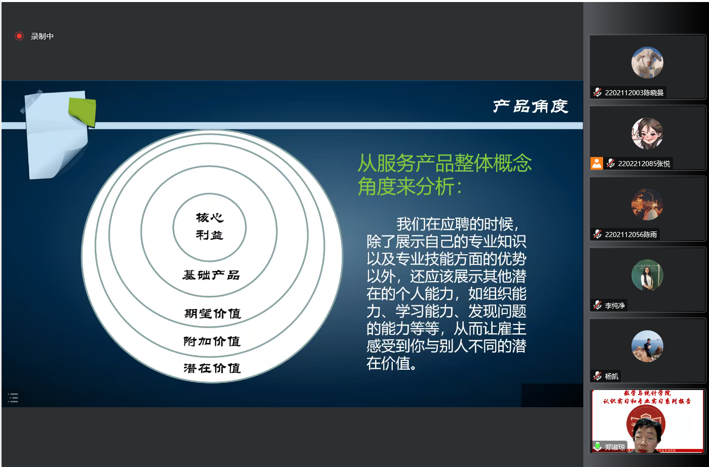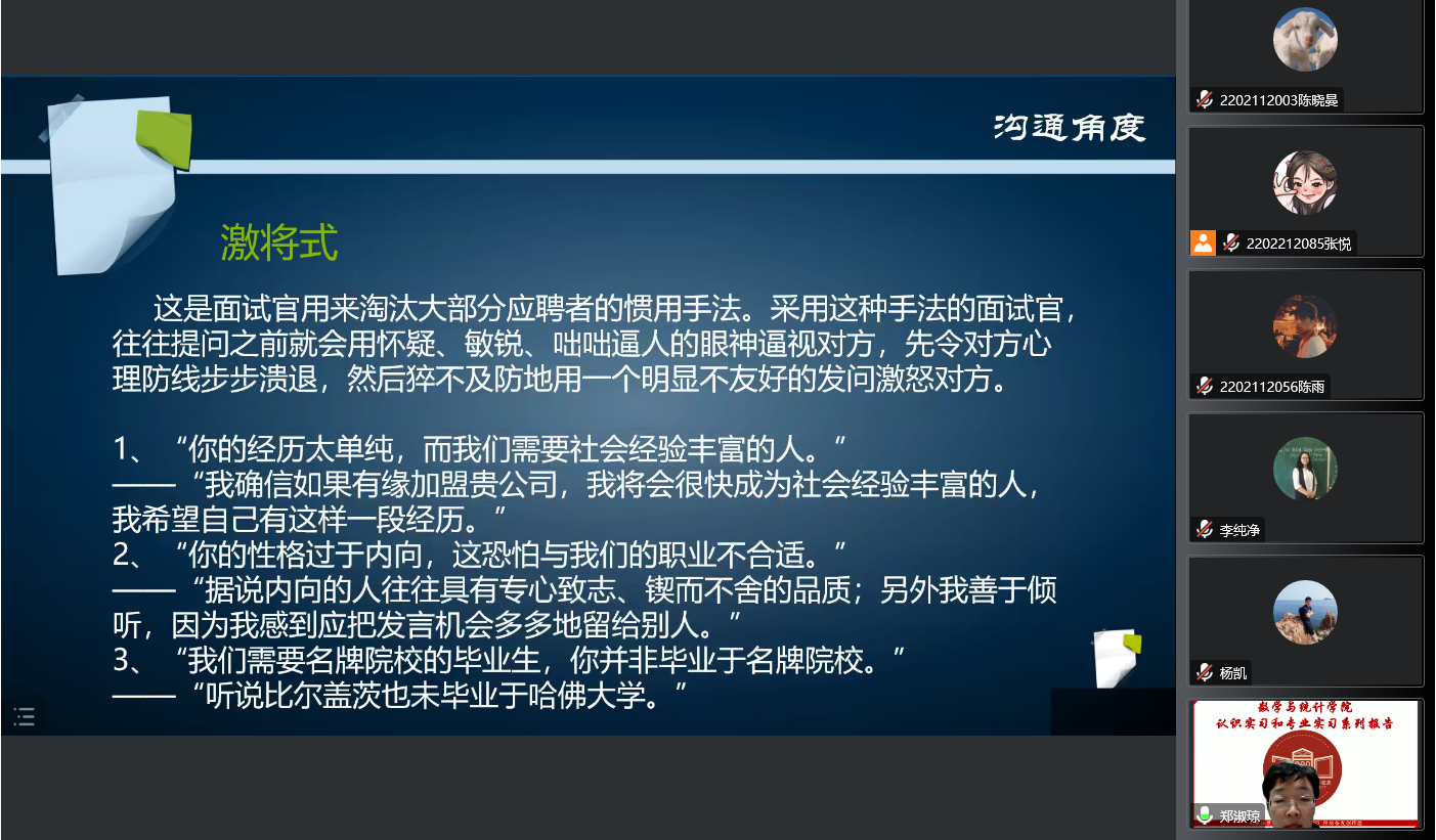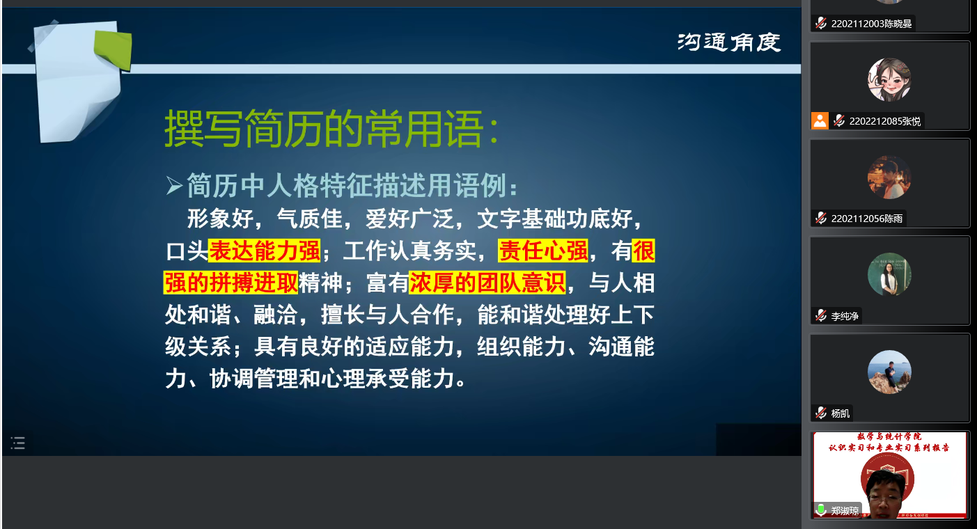 (通讯员:杨凯)2022年12月1日下午16:00,我院邀请长春启璞科技有限公司郑淑琼董事长做题为《应届毕业生应该如何找到理想的工作》的报告。本次报告由学院统计系主任杨凯主持,学院副院长李纯净、统计系支部书记袁晓惠,以及统计系胡茜等青年教师以及2020级、2019级本科生以及研究生参加了本次线上报告。