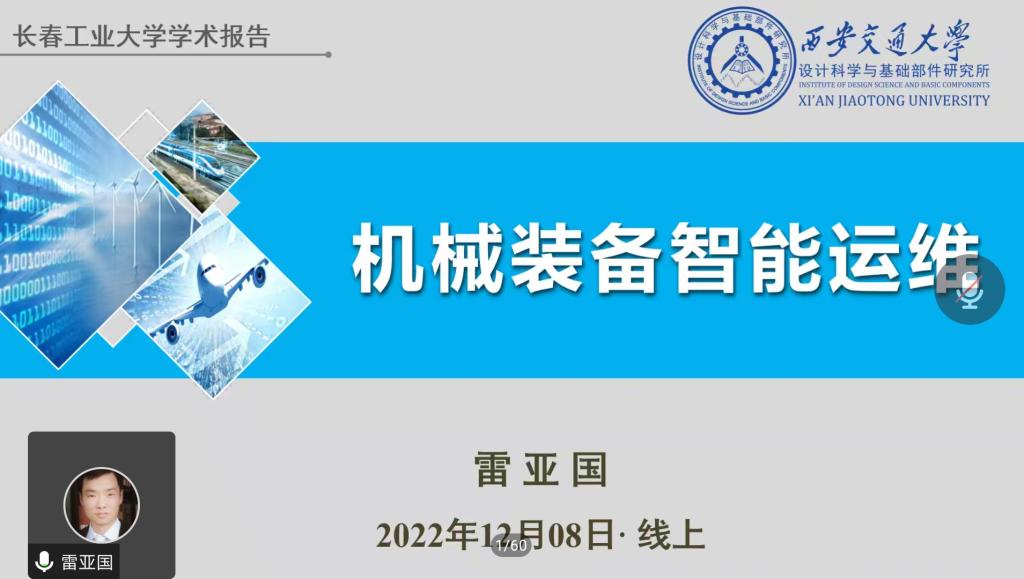 (通讯员:关迪)为丰富学生的学习生活,提高学生的综合能力,2022年12月8日下午19:30,由科研处和Beat365中文官方网站承办的“机械装备智能运维”在腾讯会议线上举行,特邀西安交通大学雷亚国教授做报告,为Beat365官网师生进行讲解,Beat365中文官方网站院长王纯杰、副院长李纯净、统计系主任杨凯、学院部分老师,本科及研究生共215人参加本次线上学术报告,报告由院长王纯杰主持。
