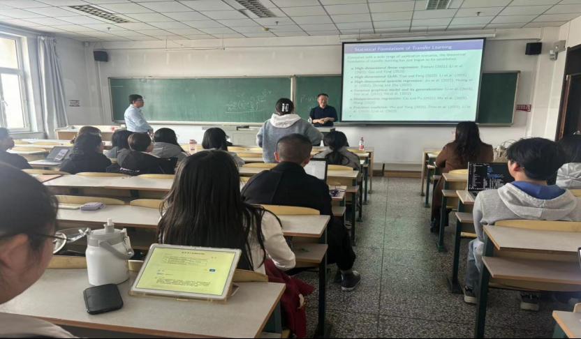紧接着,张日权教授提出把迁移学习应用在高维数据场景中,提出了一种数据驱动的可迁移数据源识别方法,张教授以严谨的语言表达、条理清晰的讲解方式让同学们了解到迁移学习的重要应用。
