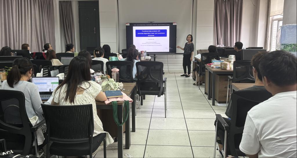 报告会中,林教授讲到目前的状态下,在将响应曲线的协方差结构与外部协变量联系起来方面取得的进展有限,因为大多数功能模型都假设一个共同的协方差结构。而本次讲座主要就介绍了提出的一种依赖于协变量的均值和协方差结构的新的功能回归模型。这样就允许随机分数的方差依赖于协变量,从而可以用一组控制所有个体变异模式的特征函数中确定每个个体的特征函数,从而实现较高的预测能力。林教授讲到该方法的实用性通过模拟和对雅芳父母与子女纵向研究(关于父母对其后代生长曲线的影响的分析)得到证明,并产生了极其有趣的结果。