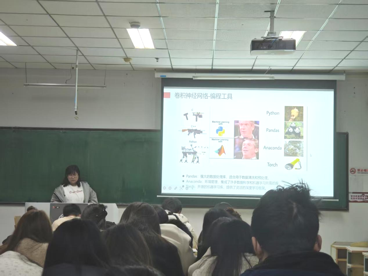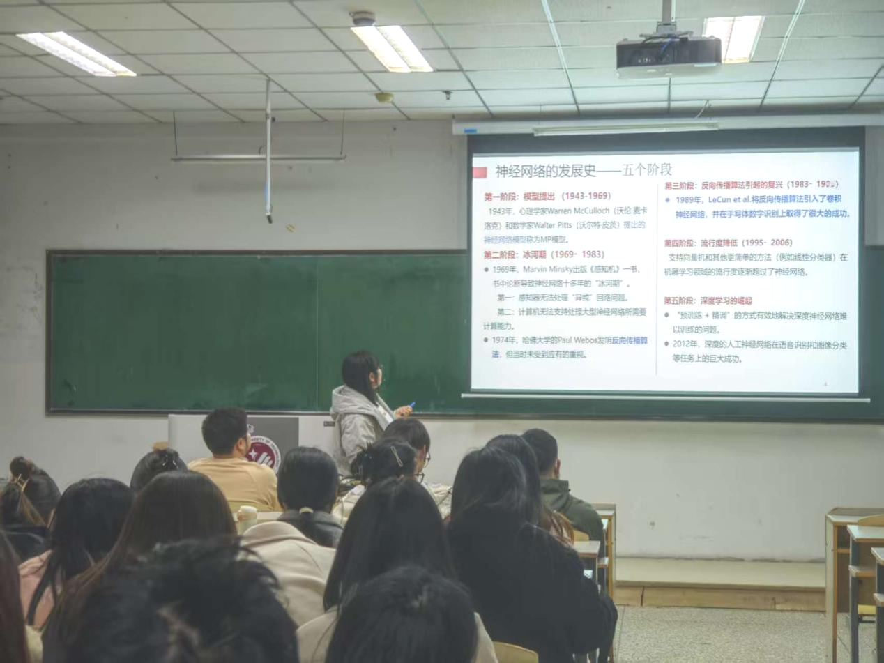 在报告中,初雅莉博士为同学们细致讲解了关于神经网络的发展历程。其主要分为五个阶段,从1943年Warren McCulloch和Walter Pitts提出的MP模型,到因《感知机》论断陷入的“冰河期”,再到反向传播算法带来的复兴,以及流行度降低,直至深度学习崛起。神经网络在曲折中不断前行,最终在语音识别、图像分类等领域取得巨大成功,为深度卷积神经网络的发展奠定了坚实基础。