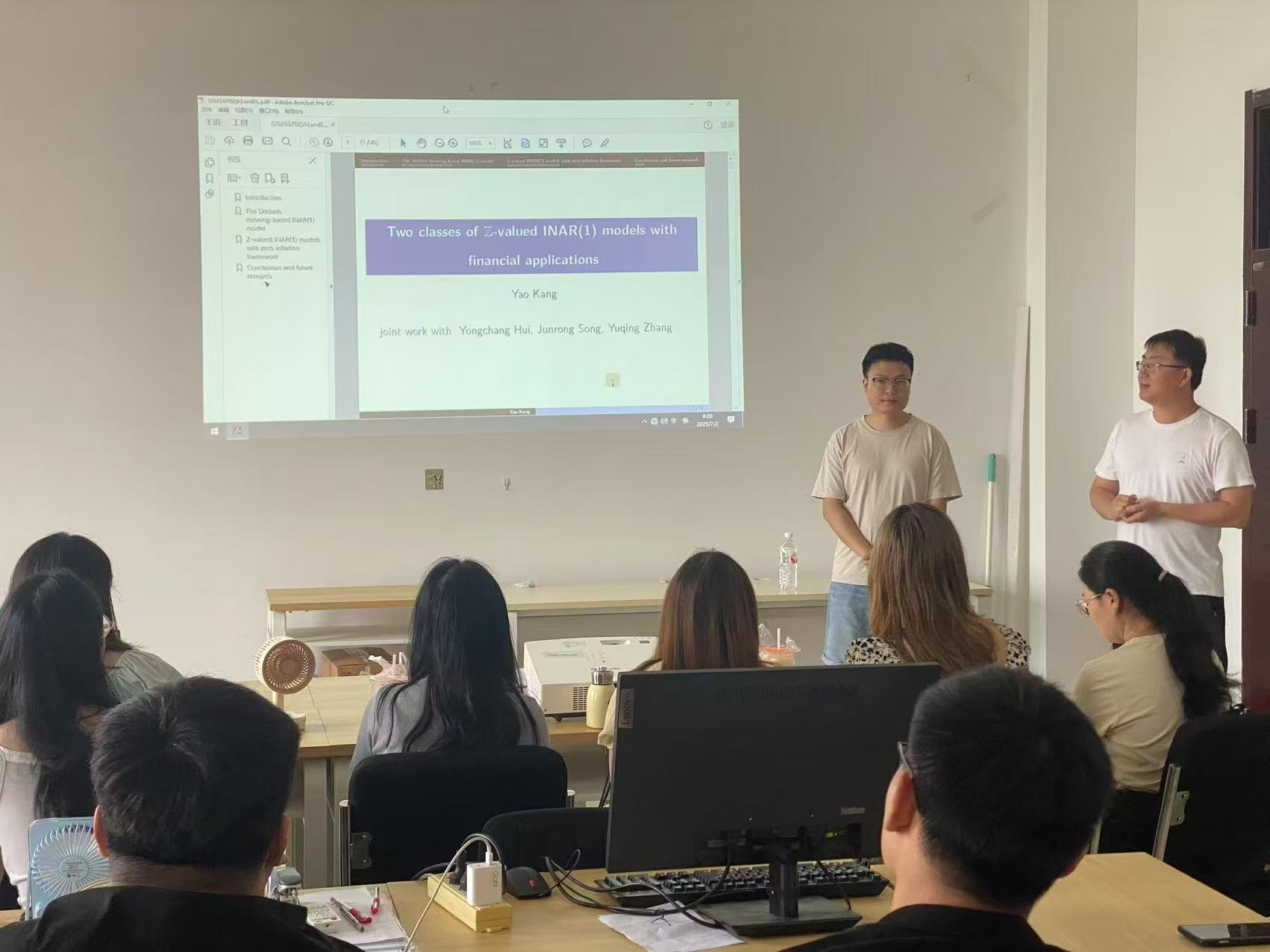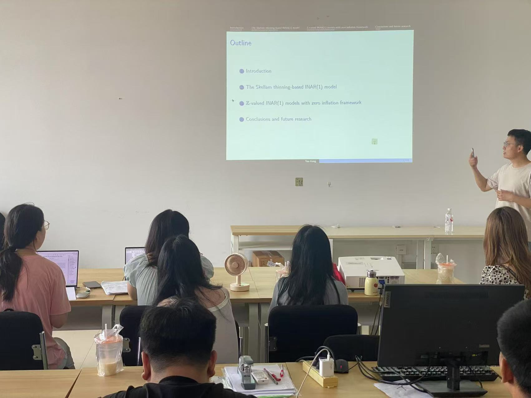 报告会中,康老师主要介绍了两类整数值自回归时间序列模型。首先说明了这两类模型建模想法的来源并对两类稀疏算子(二项系数算子、广义幂级数系数算子)进行了介绍。其中利用零膨胀泊松分布构造第二个模型,并利用开放式共同基金数据作为moxin的实例数据进行分析。还利用矩估计,条件最小二乘,条件极大似然对模型的参数进行估计,模拟研究发现条件条件极大似然估计参数的效果在三个方法中是最优的。此外报告还介绍了模型的统计推断,并对模型进行了拟似然估计。最后康副教授对论文的不足进行了分析改进,并对未来研究的内容做了展望。