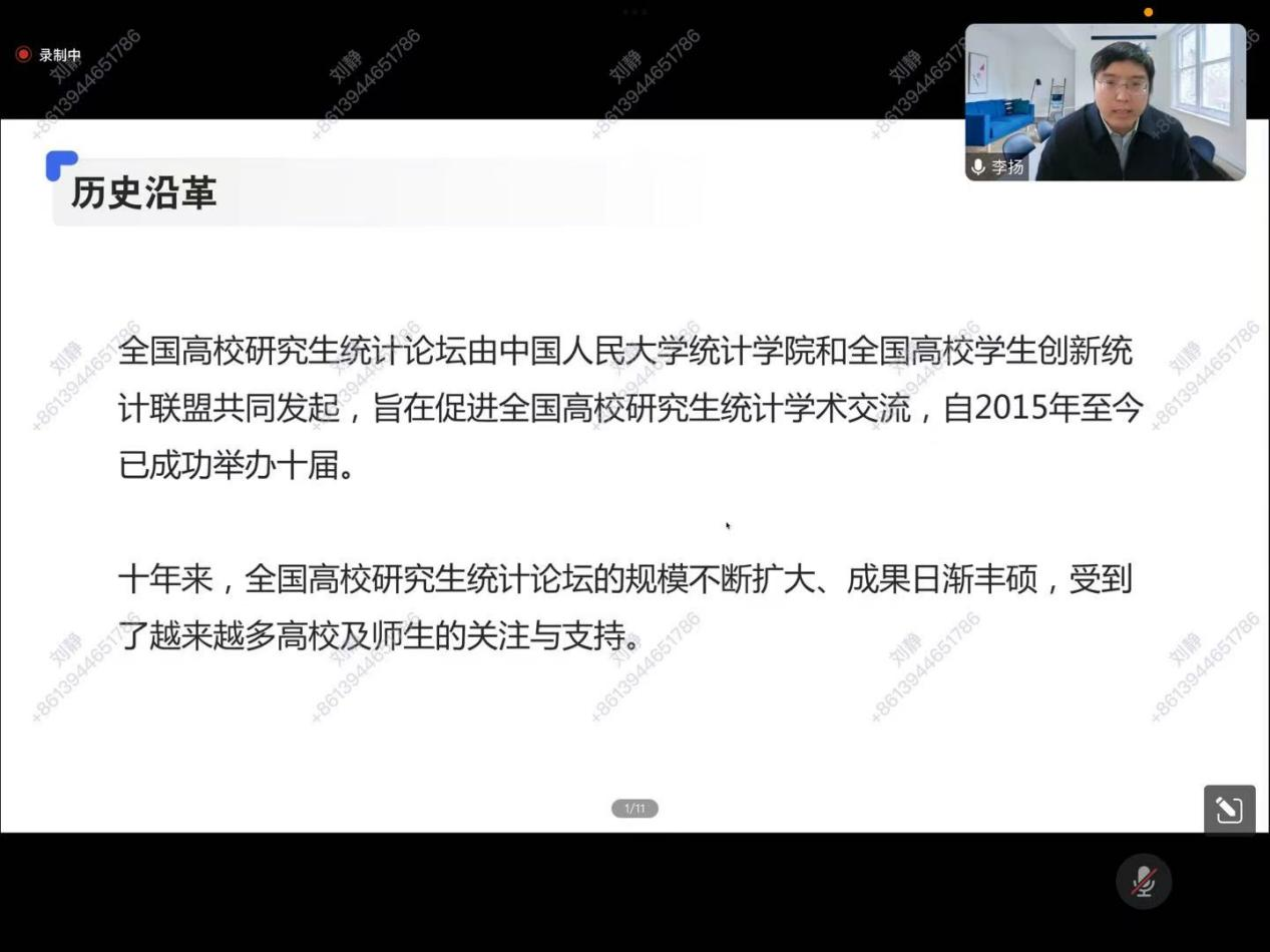 报告题目:本次学术报告由中国人民大学统计学院李扬教授主讲,主题为“全国高校研究生统计论坛组织经验分享”。