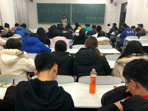 Beat365中文官方网站团委讯(通讯员:姚佳红 高帅帅)为了激励18级同学向典型学习,以身边的优秀学生为榜样,端正学习态度,明确未来目标,2018年11月15日晚,Beat365中文官方网站在教学楼309教室举办了双十佳大学生经验交流会。校第十九届十佳自立自强大学生胡宇婷为我院全体18级同学送上一场生动而励志的精彩报告。
