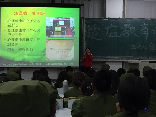 张老师为让同学们初步了解心理科学,结合了自己丰富的临床经验,深入浅出地解释心理健康就是生理、心理与社会的统一体。她与同学们进行积极的互动,提出哲学中的三个问题:“我是谁?”、“我从哪里来?”、“我要到哪里去?”,使同学们陷入了深深的思考中,并开始规划自己的人生。在谈到如何培养自己的心理素养时,张老师从军训说起,军训是大学生活的第一步,对大学新生进行军事化的训练与军营文化的熏陶,是高等教育中不可缺少,不可替代的一环节。通过严格的军事训练,可以提高同学们的政治觉悟,激发爱国热情,培养艰苦奋斗、刻苦耐劳的坚强毅力和集体主义精神,增强国防观念和组织纪律性,养成良好的学风和生活作风。其次,从大学生活方面而言,学习是大学生最首要的任务,它关联到同学们自身文化素质以及内涵的培养。最后,她提到当代大学生目前正面临的主要心理问题有:挂科的无奈、上网成瘾、寝室朋友交际关系不好等。她在解释这些问题如何产生的同时给出了恰当的解决方法。同学们在适应新环境时要悦纳自我,顺其自然、宽容大度地与新同学和谐相处;在应对各种压力时要积极的自我暗示、自我放松,并勇于迎接挑战。