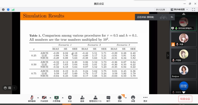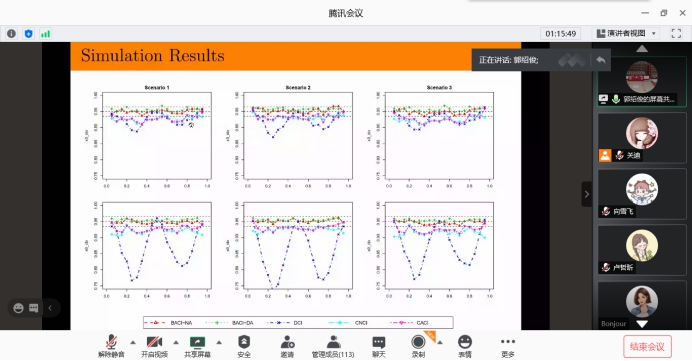 报告会中,郭绍俊教授介绍了如何从优化的角度为条件分位数函数构造更好的非参数置信区间的问题,讲解应用基于局部多项式平滑的全数据驱动偏差校正程序来估计条件分位数,在理论结果的基础上,通过重采样策略构造了两个新的点态置信区间。