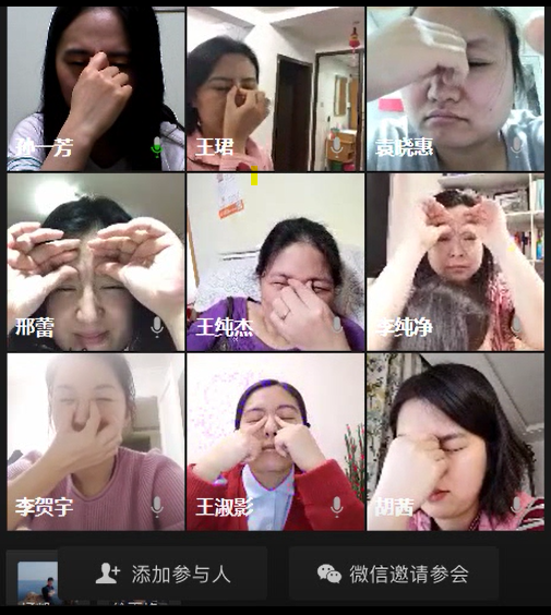 为做好线上教学,确保“停课不停学不减效”,我们的教师从2月中旬就开始对着电脑做各项准备工作,到现在每天大量的线上教学,长时间面对屏幕,眼睛和大脑都处于紧张状态,学院妇委会带领大家一起做眼保健操,放松眼睛,放松心情,缓解疲劳。