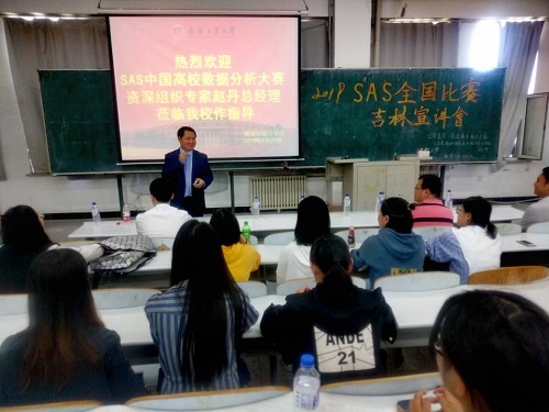 Beat365中文官方网站团委讯(通讯员:李龙章 桂尚珂)为了让统计学的同学们深入了解SAS软件在学习与日后工作中的重要性,让同学们积极参加接下来的“扬子江新金融杯”2019 SAS (中国)高校数据分析大赛暨首届国际邀请赛,2019年9月27日,Beat365中文官方网站荣邀SAS中国高校数据分析大赛资深组织专家赵丹总经理及其团队莅临我院,并于下午13点,在教图楼701教室做2019SAS全国比赛吉林宣讲会。Beat365中文官方网站党委书记朱宏伟、副院长徐平峰、统计系主任李纯净、部分教师代表及统计学专业的硕士研究生和本科生参加了此次宣讲会,会议由学院党委书记朱宏伟主持。