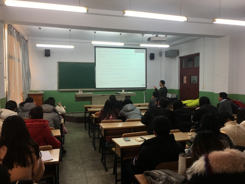 报告会中,朱文圣教授从以一些医学实例引出报告的主题,其中数据基于随机化而来的,研究的是对于不同的人给出不同治疗方案,运用动态治疗方案(一系列决策规则),主要针对的目标给出最优的治疗方案,并对条件期望进行建立线性模型,其关心的是治疗的差别,给出一些定理以及定理证明。之后,在理论的基础上,朱文圣给出了数据的模拟,用以说明理论的应用。最后,朱文圣老师对同学们提出的问题进行了详细的解答,也与学院里的老师进行了深入的互动。