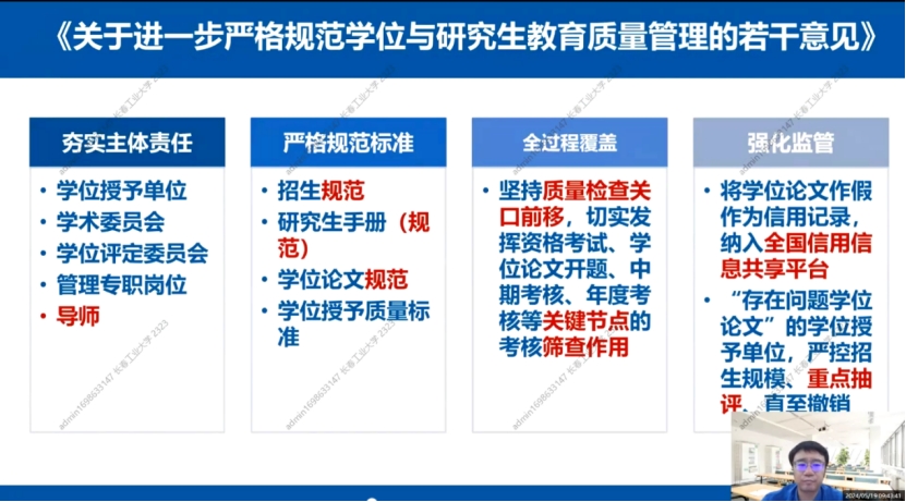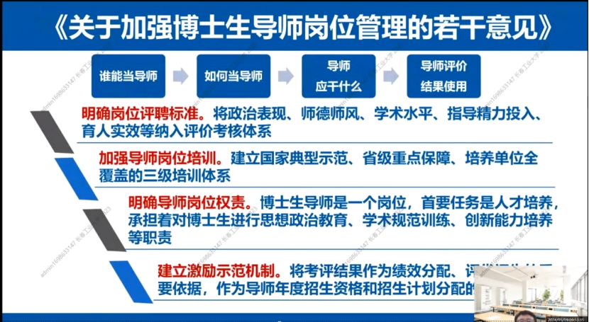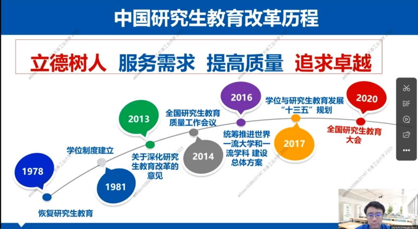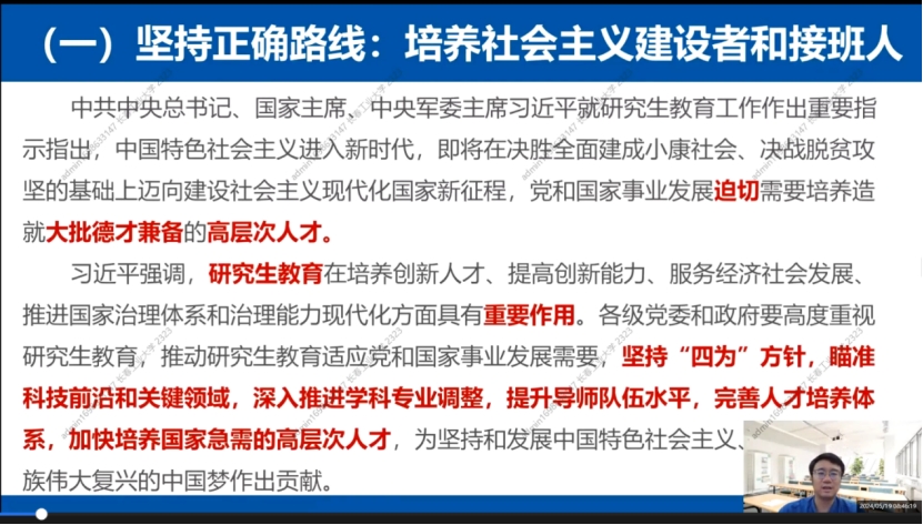 (通讯员:关迪)为贯彻落实习近平总书记关于研究生教育工作的重要指示精神,落实研究生导师立德树人根本任务,提升研究生导师教书育人能力素质,切实保障Beat365官网研究生培养质量,促进学校研究生教育事业高质量发展。根据《教育部关于全面落实研究生导师立德树人职责的意见》(教研〔2018〕1号)、《Beat365中文官方网站研究生指导教师培训管理办法》(研字〔2022〕7号)等文件精神,Beat365中文官方网站于2024年5月19日上午8点30分,第二期培训班在线上如期举行,学院副院长杨凯副教授主持会议,学院全体研究生指导教师参加了本次培训。本次培训由清华大学王传毅老师讲述面向新时代的中国研究生教育改革:近三年研究生教育重大改革政策解读。