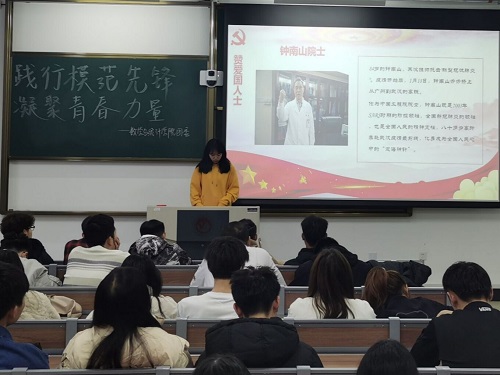 会议伊始,张辛楠首先为大家讲述了抗击疫情的艰难过程,让同学们深刻感受到了在这场同严重疫情的殊死较量中,在中国共产党的领导下,中国人民和中华民族以敢于斗争、敢于胜利的大无畏气概,铸就了生命至上、命运与共、舍生忘死、举国同心、尊重科学、气壮山河的伟大抗疫精神。此次成功抗疫在中国共产党和中华民族精神谱系中写下了浓墨重彩的一笔,铸起新时代新征程上熠熠生辉的不朽精神丰碑。随后张辛楠为大家介绍了抗疫英雄人物和他们的抗疫故事,这些抗疫英雄们鞠躬尽瘁,不畏艰险、敢于疫情作斗争的精神让人为之动容。会议的最后,张辛楠表示作为社会主义的接班人,要凝聚青春力量为抗疫贡献自己的绵薄之力,要与奋战在一线的英雄们戮力同心。